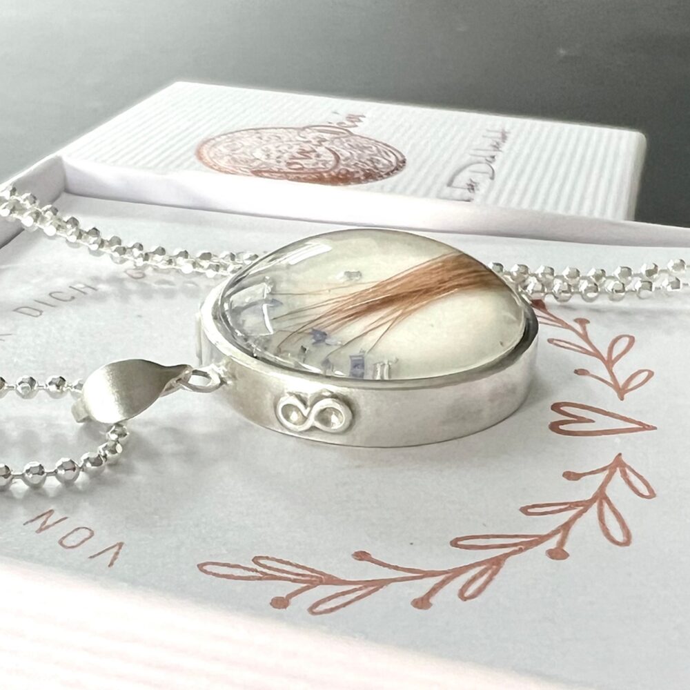 Der Kettenanhänger für dein Erinnerungsschmuckstück ist aus Silber Sterling 925 handgefertigt, die Oberfläche ist mattglanz-poliert. Darin ist das Kristallglas gefasst. In die Fassung werden nach deinen Wünschen deine ganz persönlichen Erinnerungstücke eingearbeitet. Auf Anfrage ist eine Vergoldung (hochwertige Plattierung in mattglanz oder hochglanz) möglich. Auch eine Beschriftung oder ein Symbol aus aufgelötetem Silberdraht sind möglich, die ganz andere Art der Personalisierung im Vergleich zur herkömmlichen Gravur.
