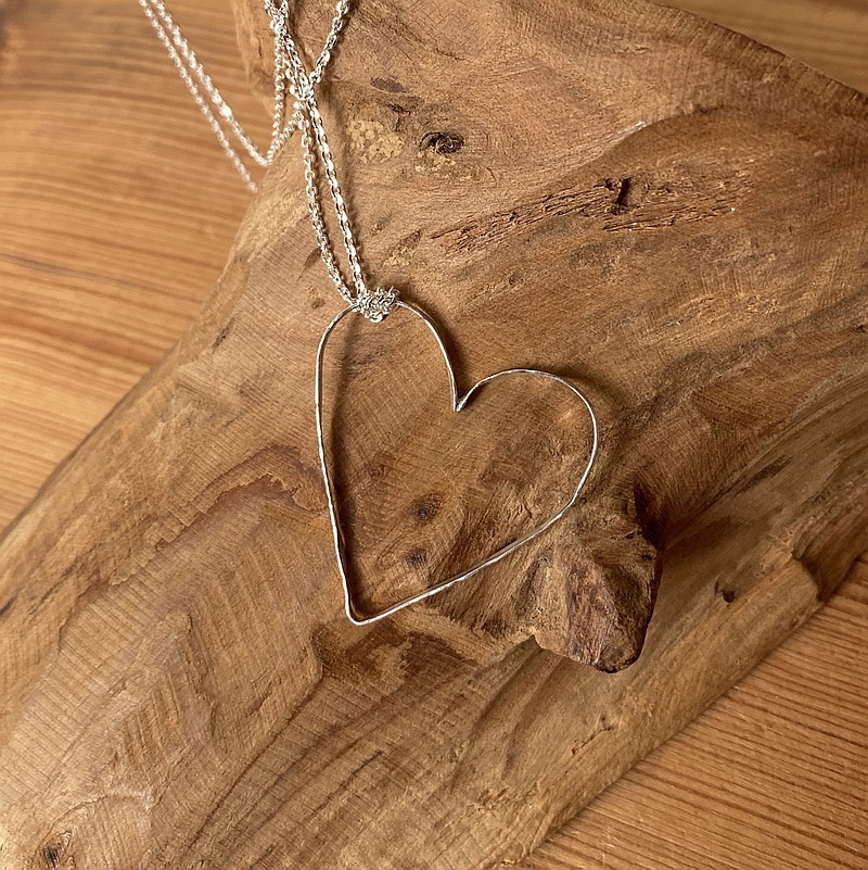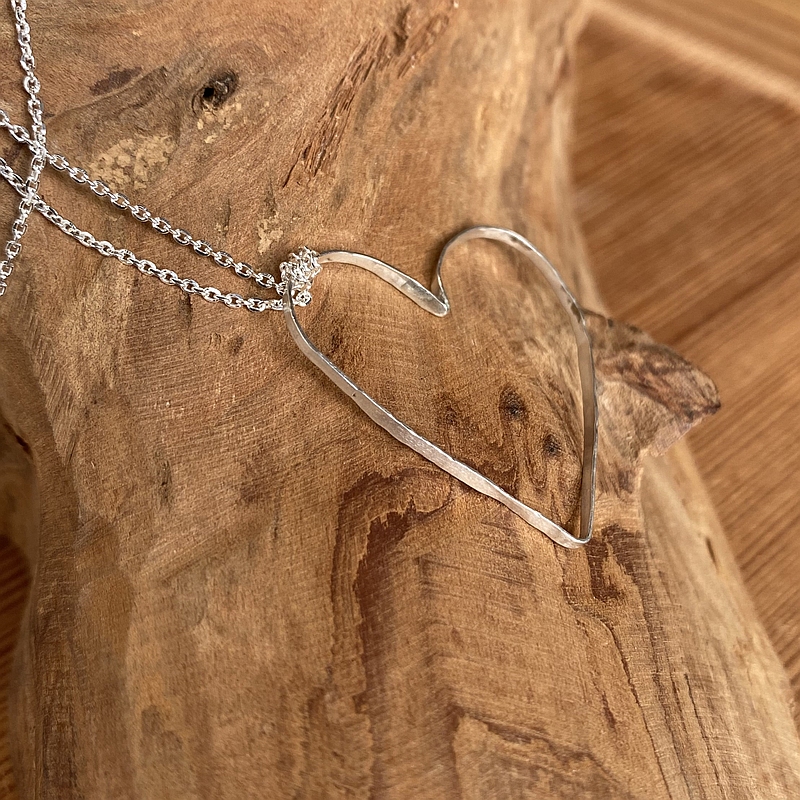 Der Kettenanhänger ist aus Silberdraht 0,8 mm handgeschmiedet und zeigt die dafür charakteristische Oberfläche. Die Oberfläche ist geglättet, so dass der Hammerschlag nur noch leicht sichtbar ist. Der Kettenanhänger ist mattglanz-poliert, die Kanten poliert. Das Silberherz ist sehr filigran und leicht gearbeitet, dazu gehört eine sehr feine Silberkette. In der Breite misst der Kettenanhänger 24 mm, in der Höhe 26 mm. Die Dicke beträgt 1,0 mm. Andere Größen sind nach Absprache gerne möglich. Die Länge der Silberkette misst 42/45 cm. Längere Silberketten sind verfügbar.
