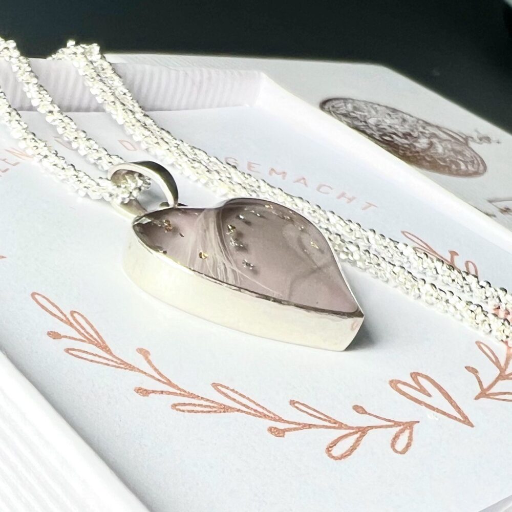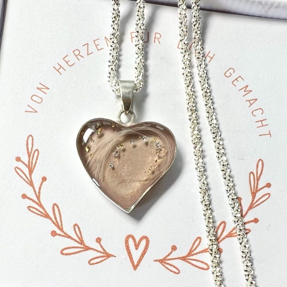 Der Kettenanhänger für dein Erinnerungsschmuckstück ist aus Silber Sterling 925 handgefertigt. Die Vorderseite, in welche deine persönlichen Schätze eingearbeitet werden, ist in Harz gegossen. Auf der Rückseite ist eine Beschriftung oder ein Symbol aus aufgelötetem Silberdraht möglich, als eine im Vergleich zu klassischen Gravuren ganz außergewöhnliche Möglichkeit der Personalisierung. Die Oberfläche ist mattglänzend gearbeitet. Auf Anfrage ist eine Vergoldung (hochwertige Plattierung in mattglanz oder hochglanz) möglich.