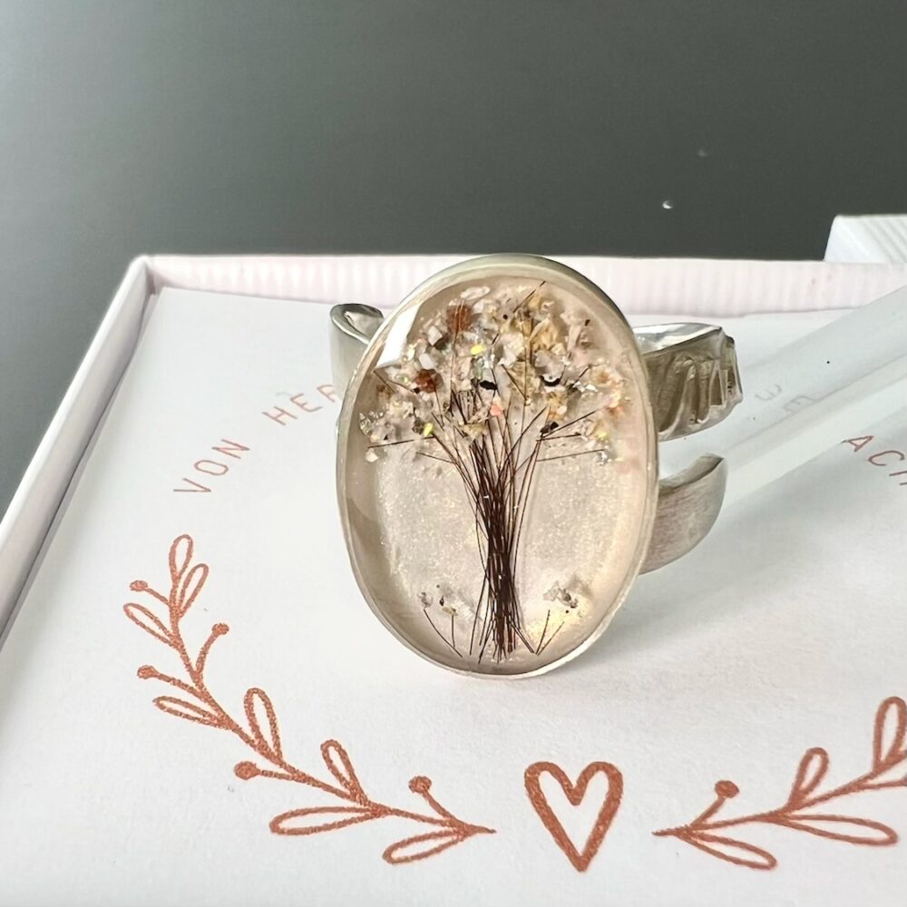 Der Ring besticht durch die als Wickelring gearbeitete Ringschiene, auf welcher die ovale Fassung für die Einarbeitung deiner persönlichen Schätze in Harz ihren Platz findet. Alternativ ist eine normale Ringschiene verfügbar wie im dritten Galeriefoto ersichtlich. Als Sonderwunsch ist wie hier auch ein Motiv möglich. Dein Erinnerungsschmuckstück ist aus Silber Sterling 925 handgefertigt. Auf der Ringschiene ist eine Beschriftung oder ein Symbol aus aufgelötetem Silberdraht möglich, als eine im Vergleich zu klassischen Gravuren ganz außergewöhnliche Möglichkeit der Personalisierung. Die Oberfläche ist mattglänzend gearbeitet. Auf Anfrage ist eine Vergoldung (hochwertige Plattierung in mattglanz oder hochglanz) möglich.